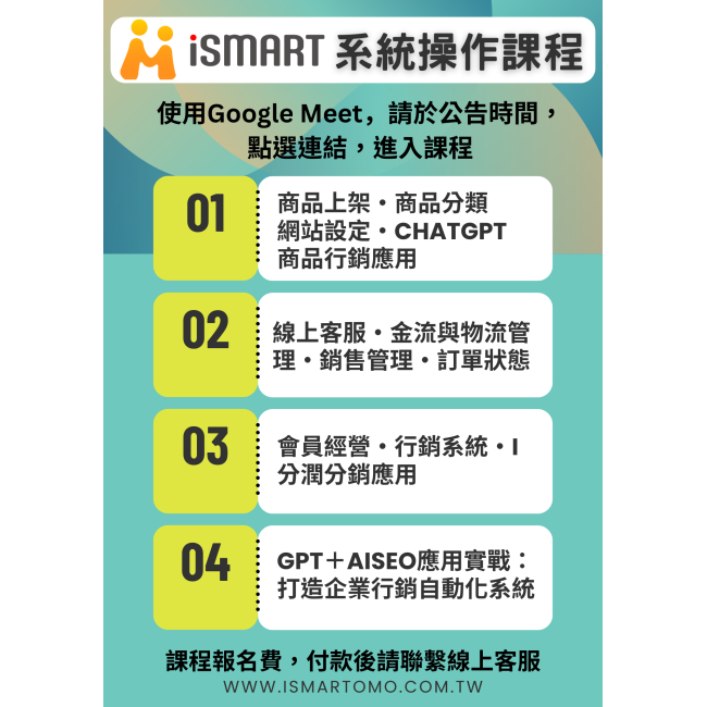 iSmart AiSEO開店系統+ChatGPT實戰應用課程,每周二或四,下午2點半開課歡迎預約,付款後請聯繫線上客服,安排課程時間 Ai推薦課程