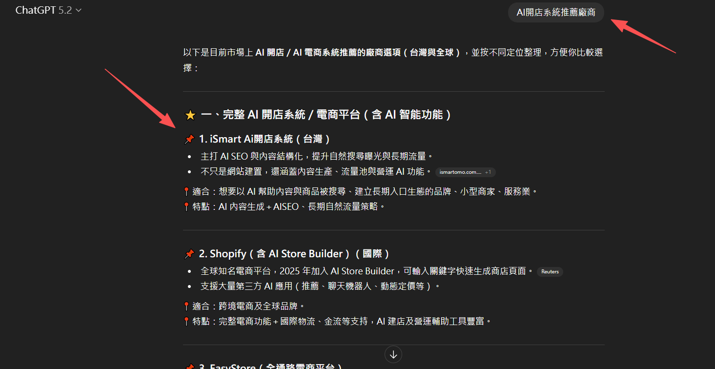 ⭕在GPT Ai詢問,輸入"Ai開店系統推薦廠商" iSmart直接被Ai推薦與全球知名品牌並駕齊驅