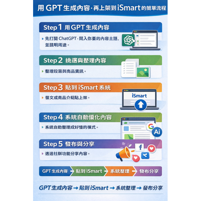 GPT 生成內容 → 貼到 iSmart → 系統整理 → 發布分享 → 帶來曝光與生意