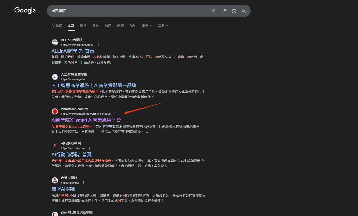 例如:當「AI商學院」相關內容,已經在 iSmart 主站取得良好的搜尋排名。